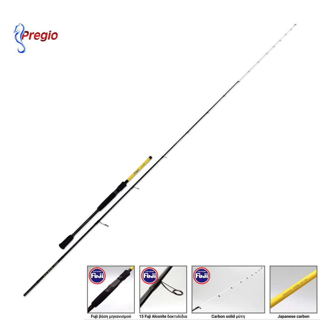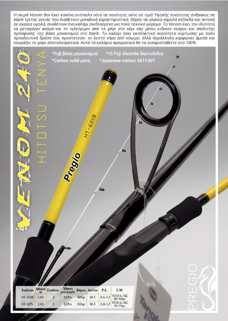 The Pregio VENOM είναι ένα τεχνικό καλάμι Hitotsu Tenya / Tenya-Jig που ξεχωρίζει για το εξαιρετικά χαμηλό βάρος, την πολύ υψηλή αντοχή και – κυρίως – την πολύ μεγάλη μεταφορά πληροφορίας στο χέρι (μέχρι και το πιο “ελαφρύ τσίμπημα”). Η δράση του είναι προοδευτική (M-F), ώστε να προστατεύει το λεπτό νήμα από κοψίματα, ενώ παράλληλα δίνει άμεσο κάρφωμα και αποτελεσματικό “κούρασμα” του ψαριού.
